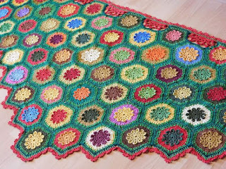 | A közel 100 db virágot aztán összehorgoltam, kitöltöttem a hézagokat és körbecsipkéztem az egészet.Csak így, egyszerűen és már kész is volt :) |