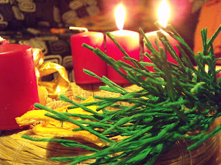És eljött a második gyertya gyújtás ideje. És nekem még mindig nem volt adventi koszorúm. Volt gyertyám, és szárított narancsom, szalag mindig van, de kéne valami kis zöld. És ekkor megláttam egy nagyon jó ötletet egy orosz kézműves oldalon. A jó kézműves mindent gyűjt, a jó kézműves semmit nem dob el, így találtam még nagyon régről kb. 40 cm zöld krepp papírt . Nem mondom, hogy nem lehetett volna körbe fenyőágas, de a 40 centi ennyire volt elég. A célnak azért így is megfelel. Sőt! :)