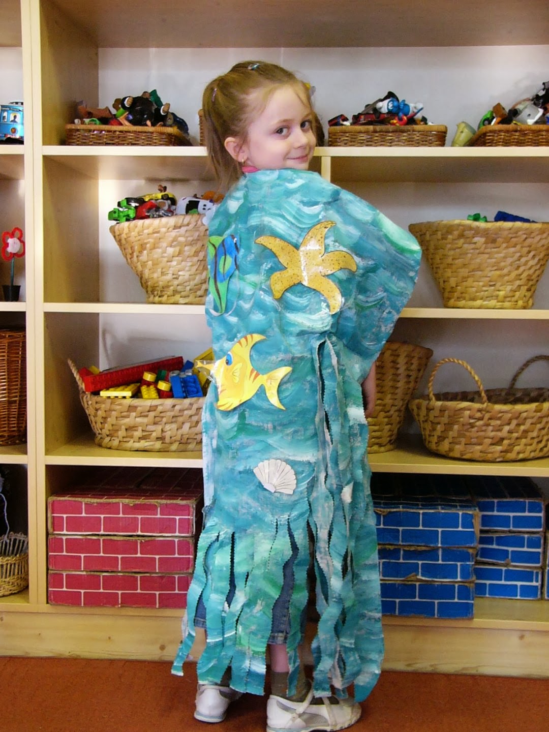 Lányom következő nagy ötlete a tenger volt. A bébiágy megmaradt, sehova se jó lepedőjét maradék falfestékkel festettük meg együtt. Aztán hosszában kettéhajtottam, kis nyílás a fejnek, oldalt karnyílásig összeöltöttem, az alját hullámosan felszabtuk, majd rajzoltam sok tengeri élőlényt amit együtt kiszíneztünk és egy-két öltéssel a ruhán rögzítettünk.
