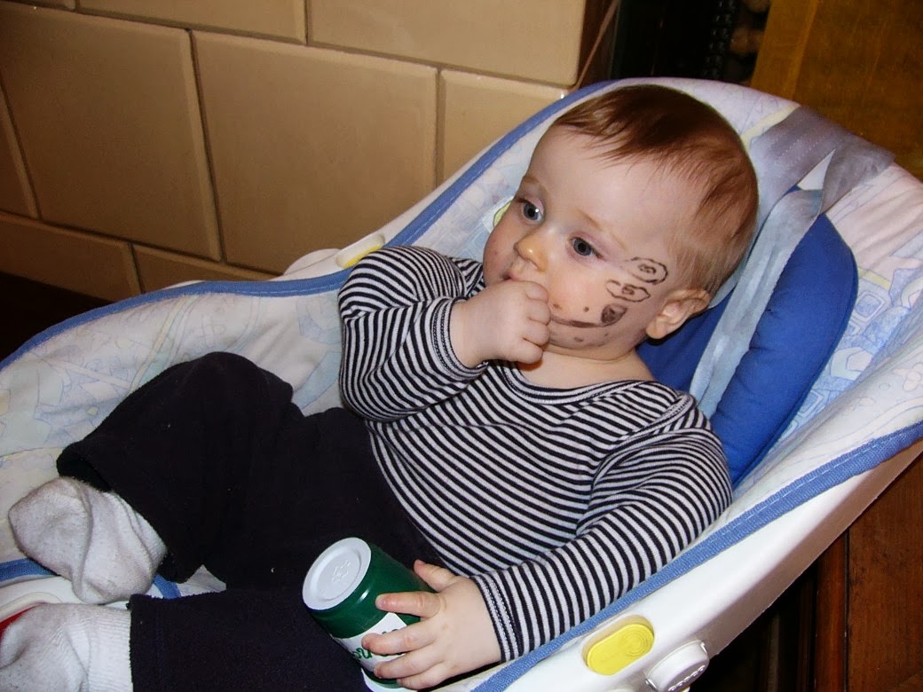 Levente még csak 1 éves, de már ekkor észrevettük, hogy rossz nevet választottunk, hiszen valójában ő maga a kis Popeye! Egy csíkos bady, egy joghurtos pohár zöld szigetelőszalaggal betekerve, ebben van a spenót, 2 zoknigombóc muszkli és némi szemceruzás arcdekor az ellenállhatatlanságának titka :)