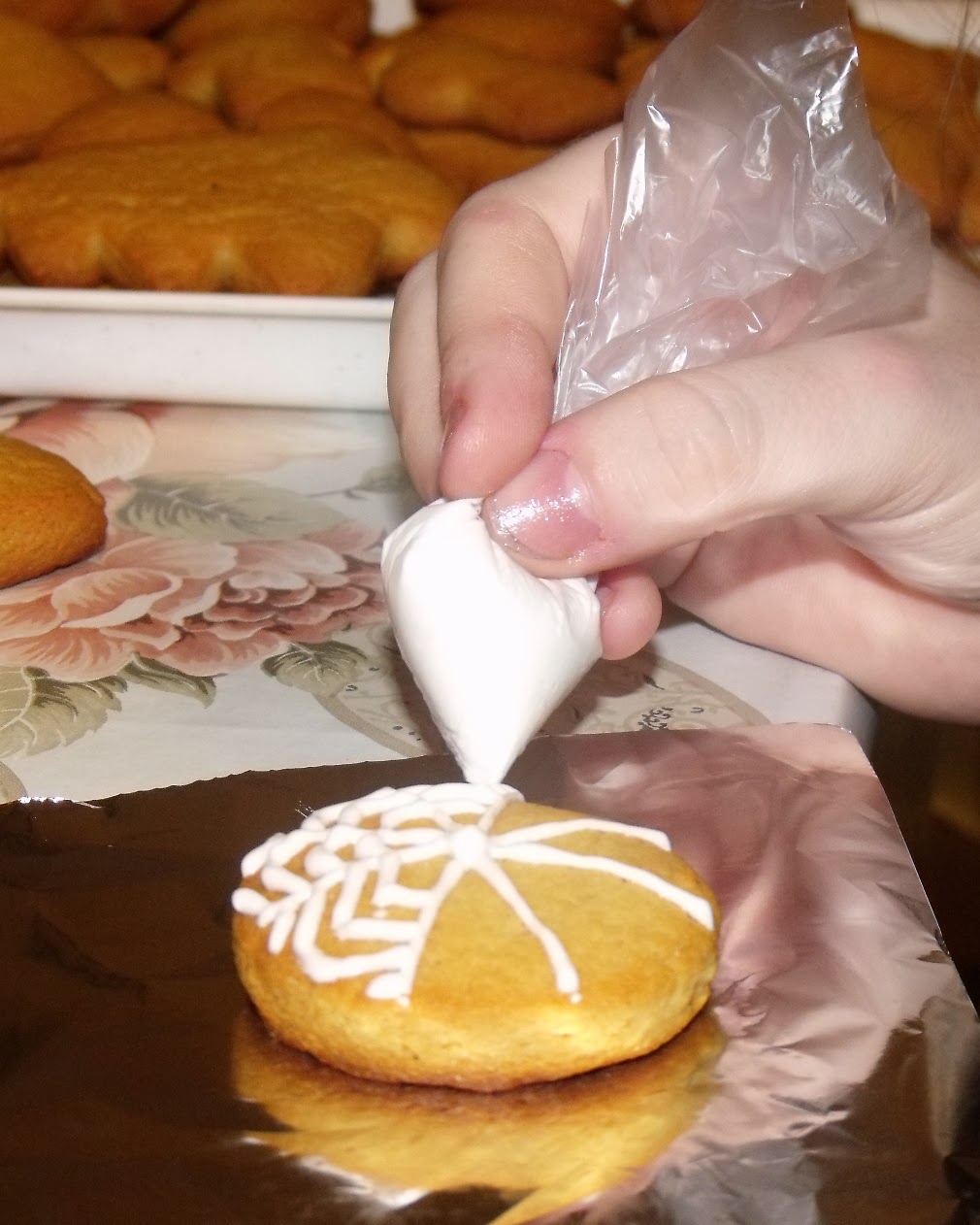 A szép írókázás titka, hogy a cukormáz kellő türelemmel és odafigyeléssel legyen elkészítve! 1 tojás fehérjéhez kb. 16 dkg porcukor kell, amit 2x átszitálunk. A második egy nagyon finom pl. teaszűrő legyen. Meg fognak lepődni akik elkészítik, hogy milyen sok kristály van a legfinomabb cukorban is. Ezek eltömíthetik az íróka nyílását. Sőt! A jégzsinórt is el kell távolítani a fehérjéből. Pici fejű fakanállal dolgozunk azért, mert a fa segít szétkenni, passzírozni a cukorszemcséket. Kicsit felverjük a tojásfehérjét, majd beleteszünk 1 teáskanál cukrot és gyors mozdulatokkal addig keverjük, míg fel nem oldódik benne. Aztán még egy kanál és teljesen kikeverjük, aztán még egy és még egy, egészen addig míg egy fényes, sima, kemény, habos masszát kapunk. A fakanálról csüngő masszával csíkot tudunk húzni, amit ha keresztezünk nem folyik egymásba. Ezután fogjunk egy kicsi nejlonzacskót, vágjuk ketté az aljától felfelé. Ezután vágjuk le a zacskó tetejét úgy, hogy kb. négyzet alakja legyen. Így 2 db. tölcsérszerű írókát fogunk kapni. Az egyiknek belefújunk a közepébe, hogy szétnyíljon és egy kanálkányit beleteszünk. Lenyomjuk a csücsökhöz a masszát és nagyon éles ollóval icike-picike lyukat vágunk rá.